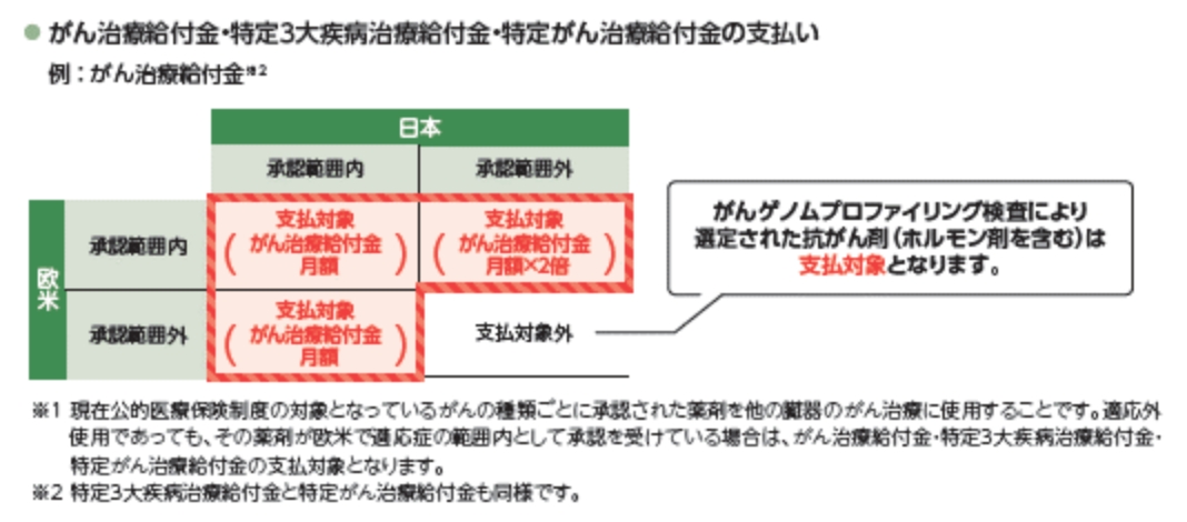 この抗がん剤(ホルモン剤を含む)治療は「がん治療給付金」「特定3大疾病治療給付金」「特定がん治療給付金」の「自由診療抗がん剤(ホルモン剤を含む)治療」として支払対象となります。