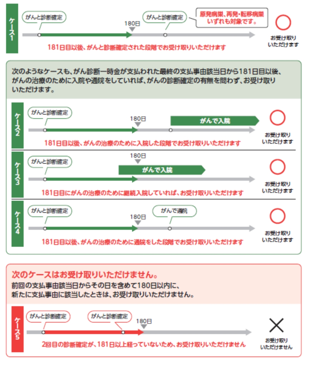 がん診断一時金が支払われた最終の支払事由該当日から181日目以後、がんと診断確定された段階で、入院・手術等の有無を問わず、お受け取りいただけます。