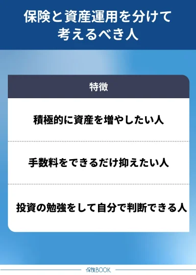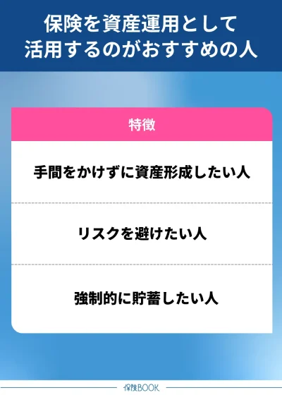 - 保険による資産運用は「保障」と「貯蓄」を両立でき、安定志向の人に向いている