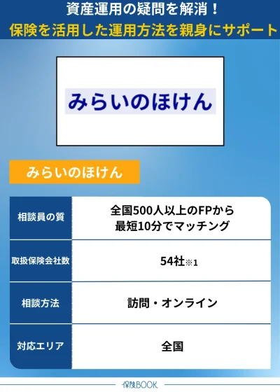 みらいのほけんは、保険や資産運用、お金全般に関する疑問や不安を無料で相談できるサービス。利用者のライフステージや家計状況、将来的な目標などを丁寧にヒアリングしたうえで、適した提携FPを紹介してくれるのが特徴です。
