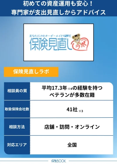 保険見直しラボは、全国41社※3の保険会社の商品を比較・選択できる無料の保険相談サービス。在籍しているすべてのプランナーがFP資格を保有しており※1、業界歴の平均は17.3年※4と、実績・経験ともに豊富な専門家が揃っています。