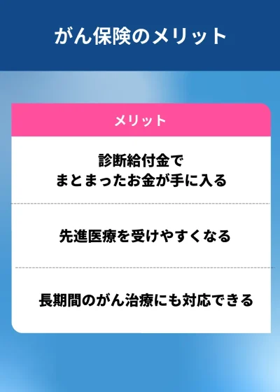 がん保険のメリットを理解することは、加入を検討する上で非常に重要です。ここでは、がん保険に加入することで得られる主なメリットを3つご紹介します。