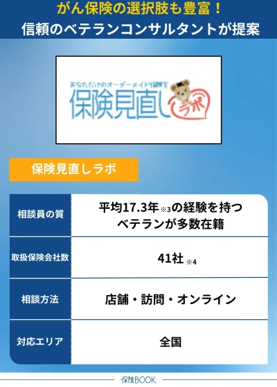 保険見直しラボは、訪問型代理店としては国内最大級の約70拠点を構える保険相談窓口。各エリアに拠点があるので、地方在住者でも対面での保険相談をしやすいのが特徴です。