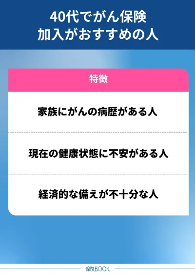 40代でがん保険加入がおすすめの人は、以下のとおりです。