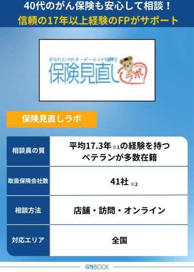 保険見直しラボは、テレビCMでもおなじみの信頼度が高い無料保険相談サービス。特に、在籍するコンサルタントの質の高さが特徴で、FP資格を持ち、業界経験年数は17.3年※1のベテランが対応します。