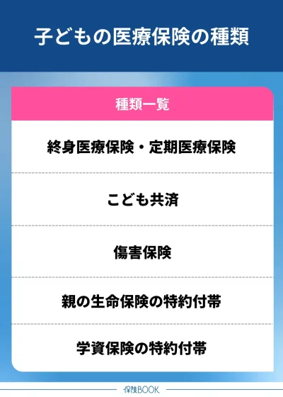 終身医療保険や定期医療保険・傷害保険・学資保険・こども共済・親の生命保険の特約付帯・学資保険の特約付帯・賠償責任保険などがあります。