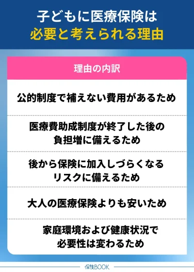 一方で、「子どもに医療保険は必要だ」と考える人も多いです。その理由は、主に以下のとおりです。