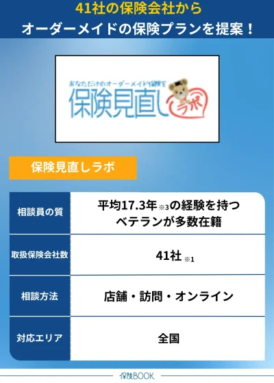 保険見直しラボは、41社※1の保険会社の商品を取り扱い、個々のニーズに合わせたオーダーメイド型の保険プランを提案する無料相談窓口。子どもの終身医療保険や定期医療保険、学資保険など、多岐にわたる保険相談に対応しています。