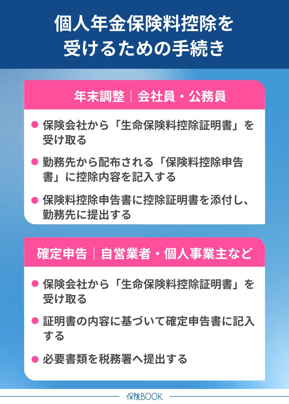 個人年金保険料控除を受けるには、勤務先の年末調整または確定申告で手続きを行う必要があります。