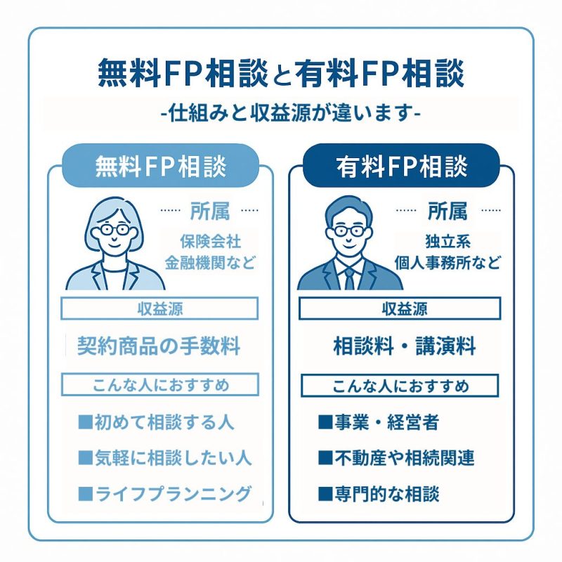 無料FPと有料FPには、所属先や提案できる商品、報酬の仕組みなどに違いがあります。そのため、相談したい内容に応じて使い分けるのがおすすめです。