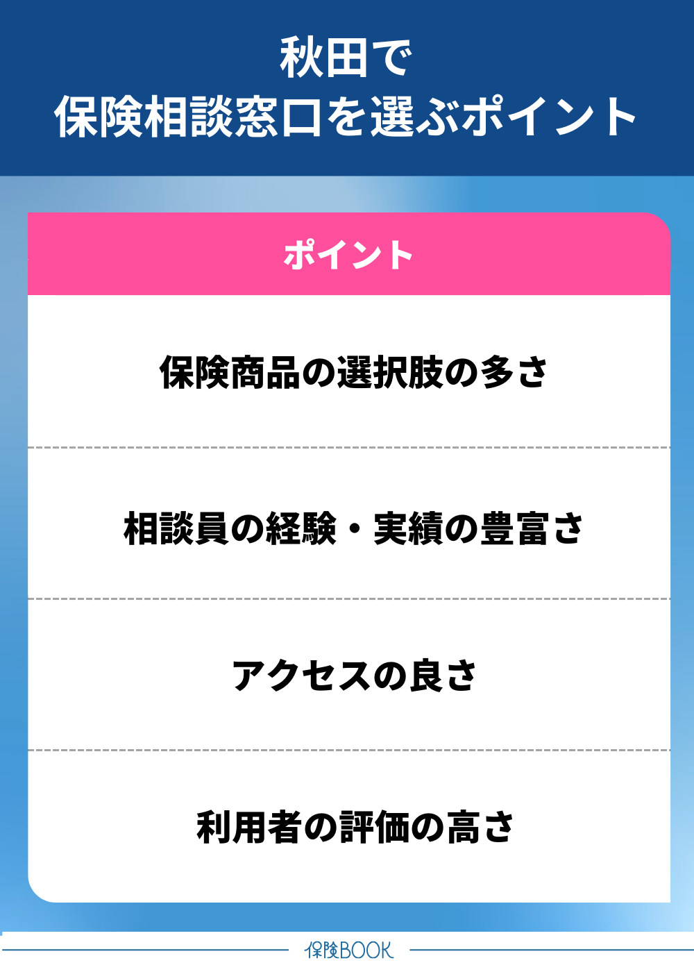 秋田で保険相談窓口を選ぶポイントは、以下の通りです。