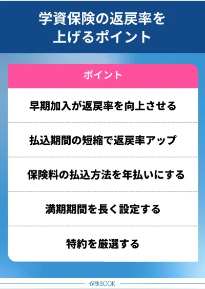 学資保険の返戻率を上げるポイントは、以下のとおりです。