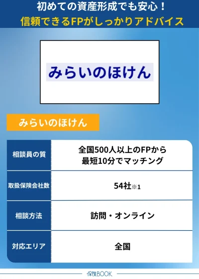 みらいのほけんは、なないろ生命のグループ会社が運営する無料の保険相談サービスで、信頼性の高さが魅力です。全国に500名以上の提携FPが在籍しており、その中から自分に合った優秀な提携FPを最短10分で紹介してもらえるスピード感も特徴の1つです。
