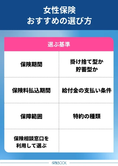 女性医療保険のおすすめの選び方は、以下のとおりです。