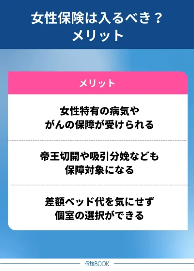 - 主なメリットは、女性の病気や妊娠・出産(乳がんや子宮がん、帝王切開に伴うリスク)に特化した保障があること