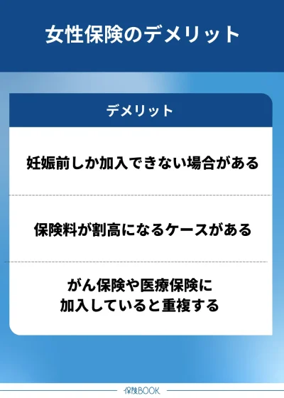 女性保険のデメリットの1つに、妊娠前しか加入できない場合がある点があります。一部の保険商品では、妊娠中の加入が制限されている場合があるのです。