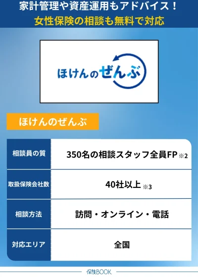 ほけんのぜんぶは、お金にまつわることについて「ぜんぶ」相談できる窓口です。すべての相談スタッフがファイナンシャルプランナー資格を保有しており、女性保険をはじめ医療保険、死亡保険、損害保険など幅広い商品に対応しています。
