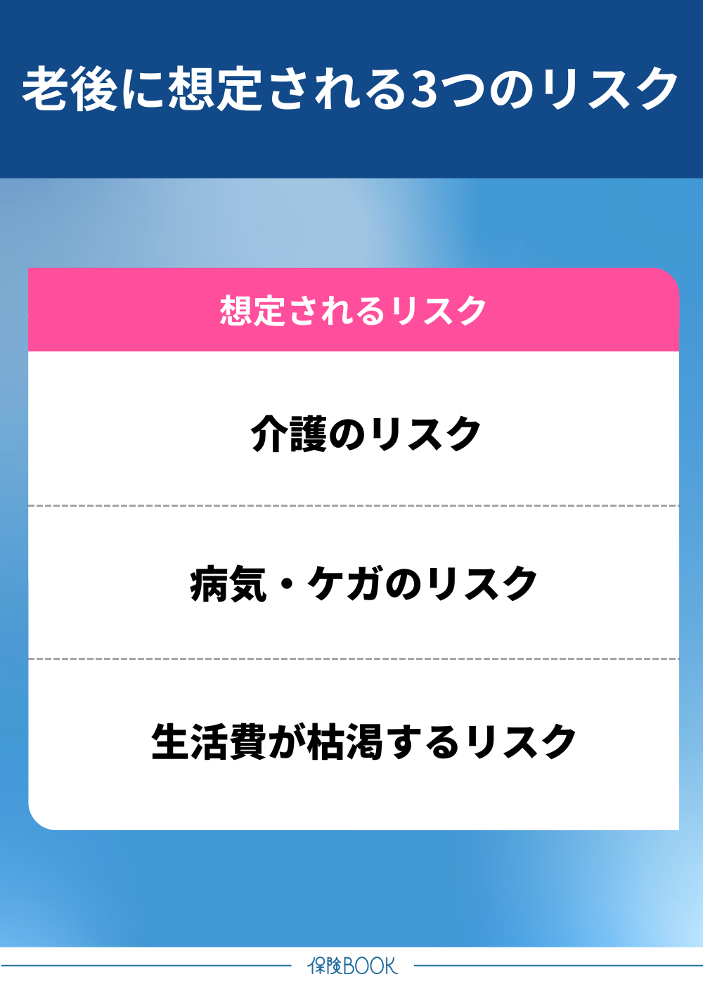 - 老後は「介護」「病気・ケガ」「生活費枯渇」の3大リスクに備える必要がある