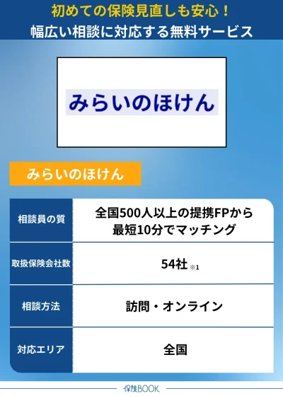 みらいのほけんは、なないろ生命グループ会社が運営する無料の保険相談サービス。保険の見直しを検討しているものの、保険証券の見方が分からない方や、持病や既往歴があるため加入できる保険があるか不安という方でも相談可能です。