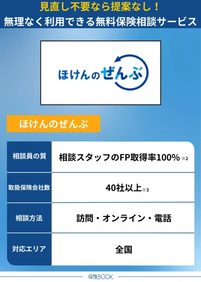 ほけんのぜんぶは、 子育て世代約7万人※1から選ばれている無料の保険相談サービス。相談するコンサルタントはFP資格取得率が100%※2のため、確かな専門知識に基づいて顧客の現状を分析し、将来設計を踏まえた保険見直しの提案を行ってくれるでしょう。