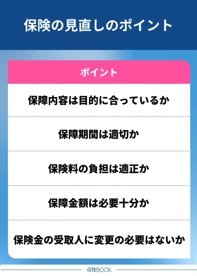 なお見直す際には、保障内容が今の目的に合っているか、保障期間は適切か、保険料の負担が無理なく払える範囲か、保障金額は必要十分か、保険金受取人の設定は現状に合っているかといったポイントを確認するようにしてください。