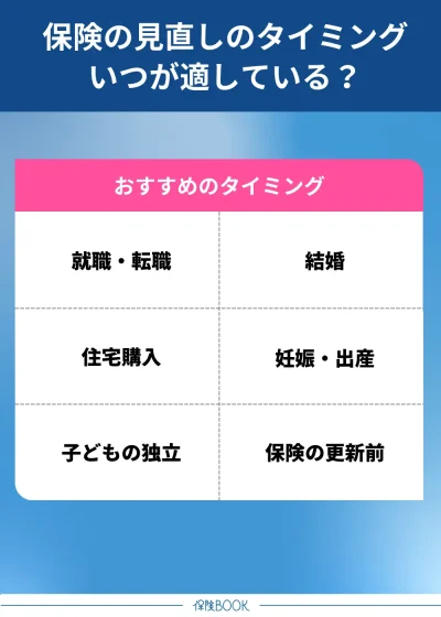- 「結婚・出産・住宅購入・転職・保険の更新時」などは、保険を見直す良いきっかけになりやすいタイミング