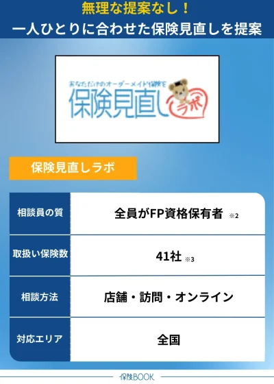 保険見直しラボは、何度利用しても相談料が無料の保険相談サービス。相談を担当するのは、全員がFP資格を保有※2している専門家であり、コンプライアンスを徹底しつつ、お客本位の視点で親身かつ丁寧に対応することを大切にしています。