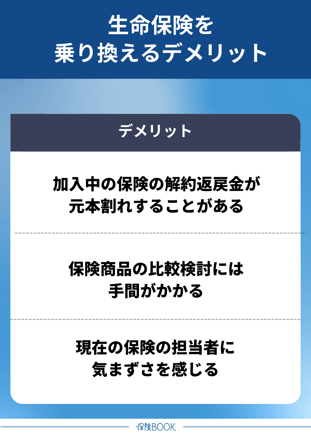 生命保険を乗り換えるデメリットは、以下のとおりです。