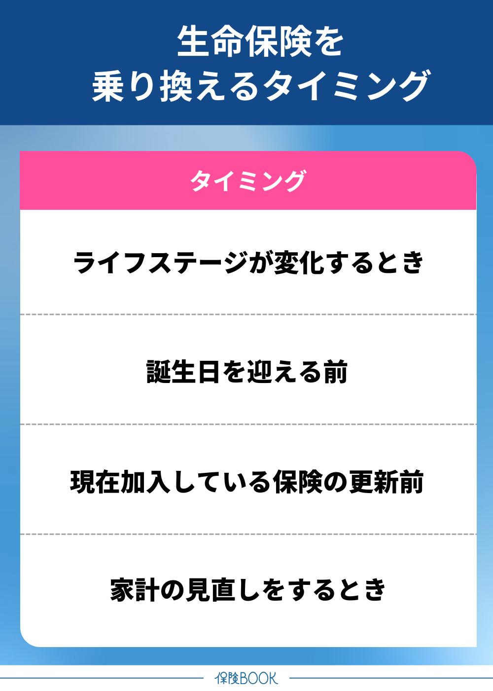 ライフステージが変化するときや現在の保険の更新前、誕生日前などは保険を乗り換える良いタイミングです。現在の保険を見直して保険料負担の重さや保障の不十分さを感じたら、乗り換えることを検討してみましょう。
