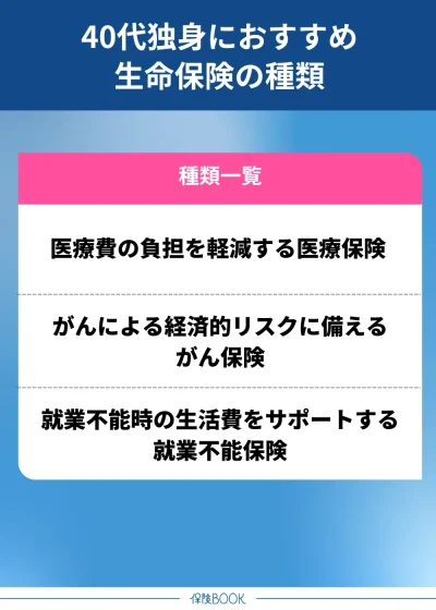 40代独身におすすめの生命保険の種類は、以下のとおりです。