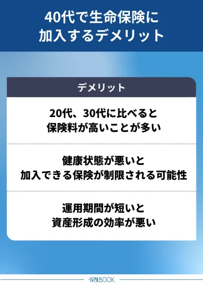 40代で生命保険に加入するデメリットは、以下のとおりです。