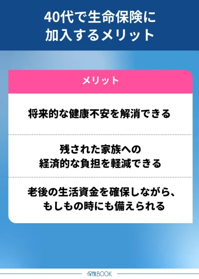 40代で生命保険に加入するメリットは、以下のとおりです。
