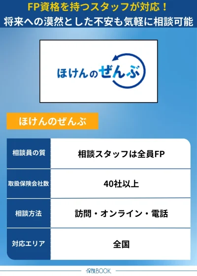 ほけんのぜんぶは、保険に関するあらゆる悩みを相談できる無料の保険相談サービスです。累計申し込み件数は31万件※1を突破し、取扱保険会社数は40社以上※2に及びます。