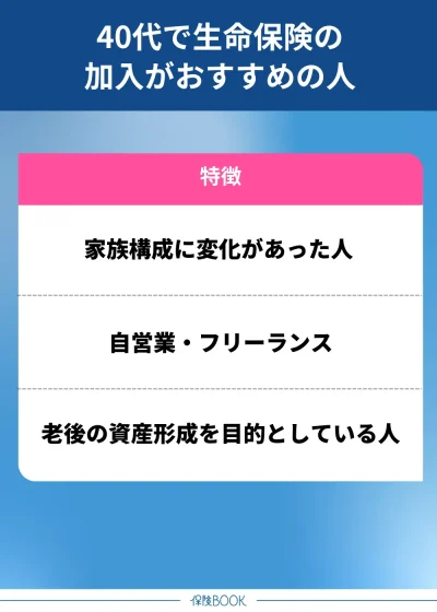40代は、健康リスクが高まり、家庭や仕事における責任も重くなる時期です。そうした状況の中で、生命保険に加入することで、将来的な健康不安の解消や、万が一の際に家族が経済的に困らないための備えとして役立てることができます。