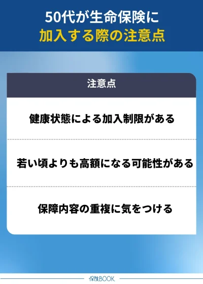 50代が生命保険に加入する際の注意点は、以下のとおりです。
