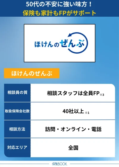 ほけんのぜんぶは、相談者の不安や悩みに寄り添う保険相談窓口。保険や家計に関することなら何でも相談できるため、お金の悩みをまとめて解消したい方に適したサービスでしょう。