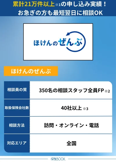 ほけんのぜんぶは「相談スタッフは全員FP※2」といった強みを持つ保険相談窓口です。生命保険や老後資金、資産運用など、お金に関するさまざまな悩みを無料で相談できます。