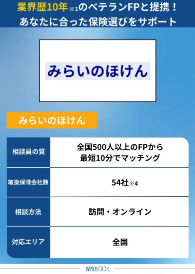 みらいのほけんは、業界経験が平均10年あるベテラン定型FP※1に無料で相談できる保険相談窓口です。