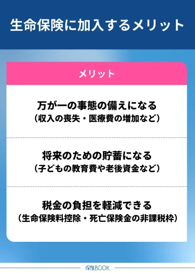 生命保険に加入する大きなメリットは、突発的な事故や予期せぬ病気といった万が一の事態が起きた際に、家族の生活を支えられる点です。