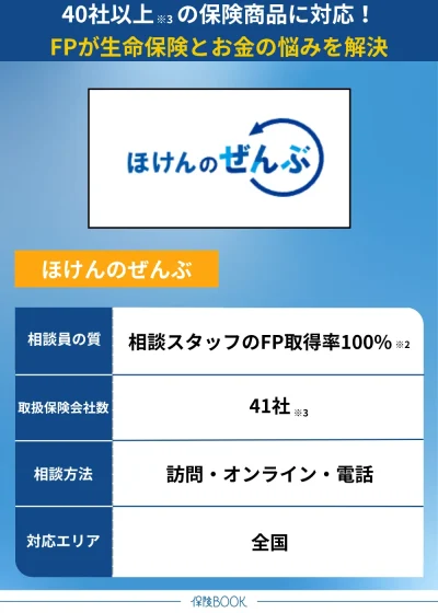 ほけんのぜんぶは、累計申込件数が31万件※1の実績を持つ保険相談窓口。取り扱う保険会社数も40社以上と豊富で、生命保険会社だけでも24社※3の取り扱いがあります。