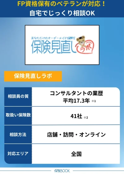 保険見直しラボは、訪問型代理店として国内最大級※4の規模を誇る保険相談窓口。全国に60拠点以上※4を構え、指定場所までコンサルタントが訪問してくれるので、都合に合わせて保険相談できるのが特徴です。