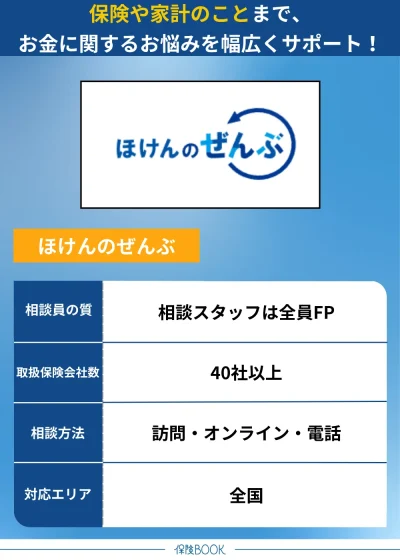 ほけんのぜんぶは、生命保険だけでなく、損害保険や家計管理など、お金に関するさまざまな相談ができる無料の保険相談サービス。がん保険や医療保険、入院保険などの相談にも対応しており、保険選びに不安がある方におすすめです。