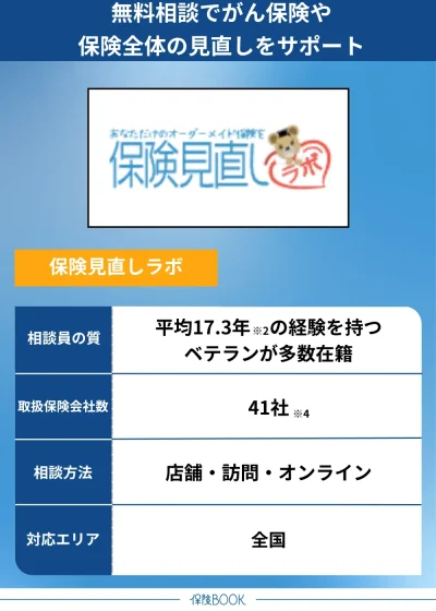 41社※4の保険会社と提携しており、がん保険、医療保険、定期医療保険、女性保険など、多岐にわたる保険商品の提案が可能。がん保険に限らず、さまざまな保険を総合的に見直すことができるので、トータルで適したプランを選びたい方におすすめです。