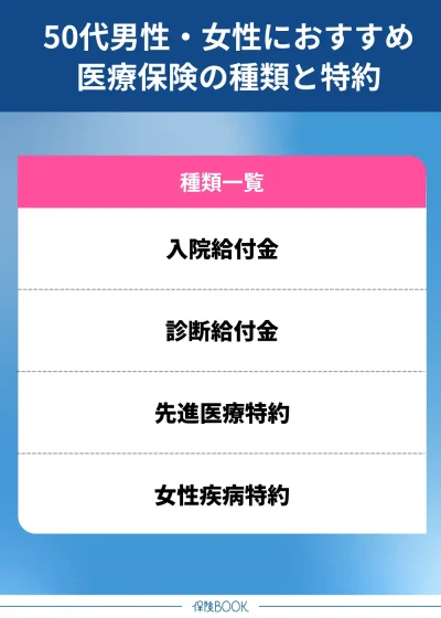 50代男性・女性におすすめの医療保険の種類と特約は、以下のとおりです。