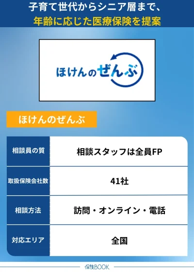 ほけんのぜんぶは、累計31万件以上※1の申込実績を誇る保険相談窓口。取り扱う保険会社は40社以上※2あり、多くの保険商品から適したプランを組み合わせることが可能です。