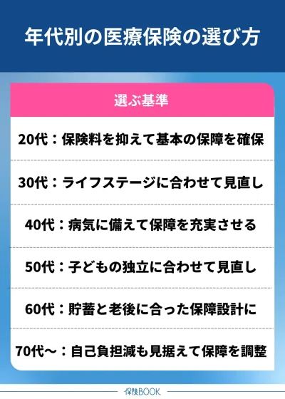 そこで本記事では、民間の医療保険を選ぶ基本的なポイントや年代別の選び方について解説します。