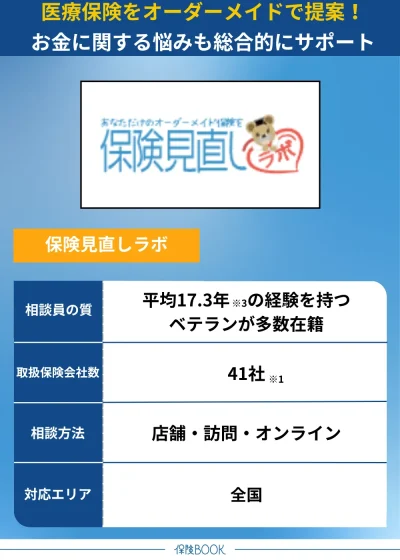 保険見直しラボは、41社※1の保険会社を取り扱う保険相談窓口。相談者の悩みを丁寧にヒアリングして、複数の保険商品の中から適した保険をオーダーメイドで提案してくれます。