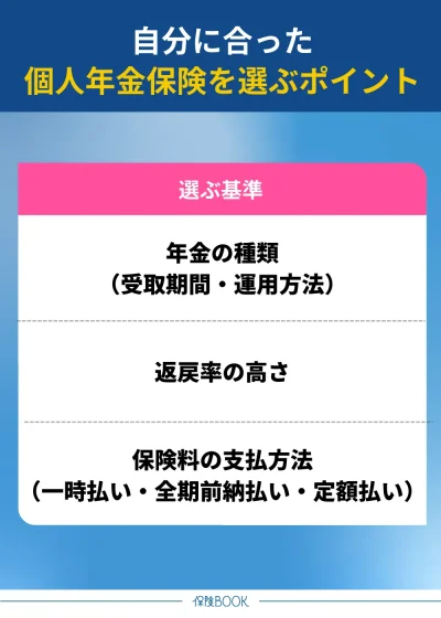 - 選ぶ際は「年金の種類(確定・有期・終身)」「返戻率」「支払方法」などを比較するのがポイント