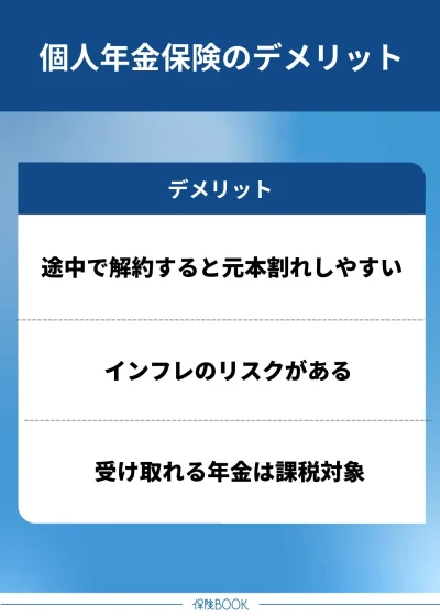 個人年金保険は長期間の積み立てが前提であり、途中解約すると元本割れする可能性があります。また、預貯金や投資で老後資金を準備できる人にとっては、低利回りの個人年金保険よりも他の資産運用方法の方が効率的な場合もあります。