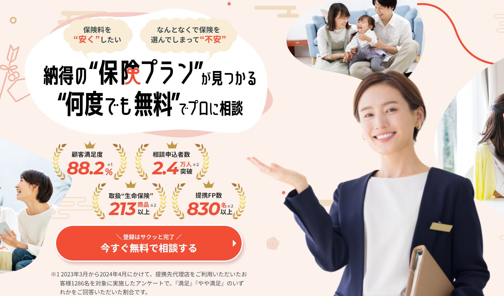 FPは業界経験平均10.48年※2のベテラン揃いで、保険提案だけに限らず住宅資金準備やNISAなどの資産形成に関する相談にも親身に対応してくれるので初めての保険相談におすすめです。